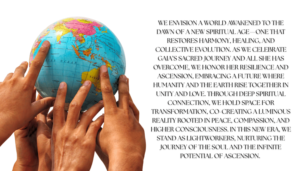 We envision a world awakened to the dawn of a new spiritual age—one that restores harmony, healing, and collective evolution. As we celebrate Gaia’s sacred journey and all she has overcome, we honor her resilience and ascension, embracing a future where humanity and the Earth rise together in unity and love. Through deep spiritual connection, we hold space for transformation, co-creating a luminous reality rooted in peace, compassion, and higher consciousness. In this new era, we stand as Lightworkers, nurturing the journey of the soul and the infinite potential of ascension.
